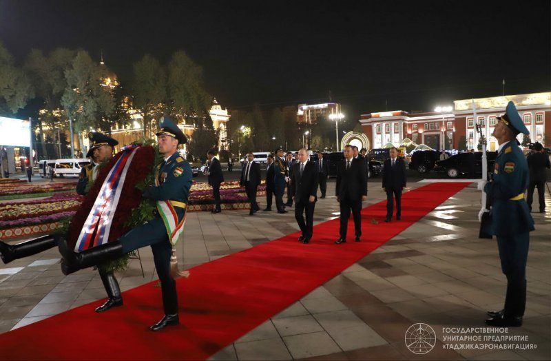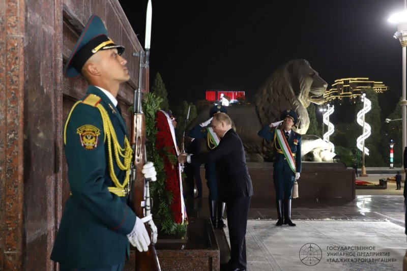 В церемонии возложения венка Президента Российской Федерации Владимира Путина сопровождали Премьер-Министр Республики Таджикистан Кохир Расулзода и другие официальные лица.