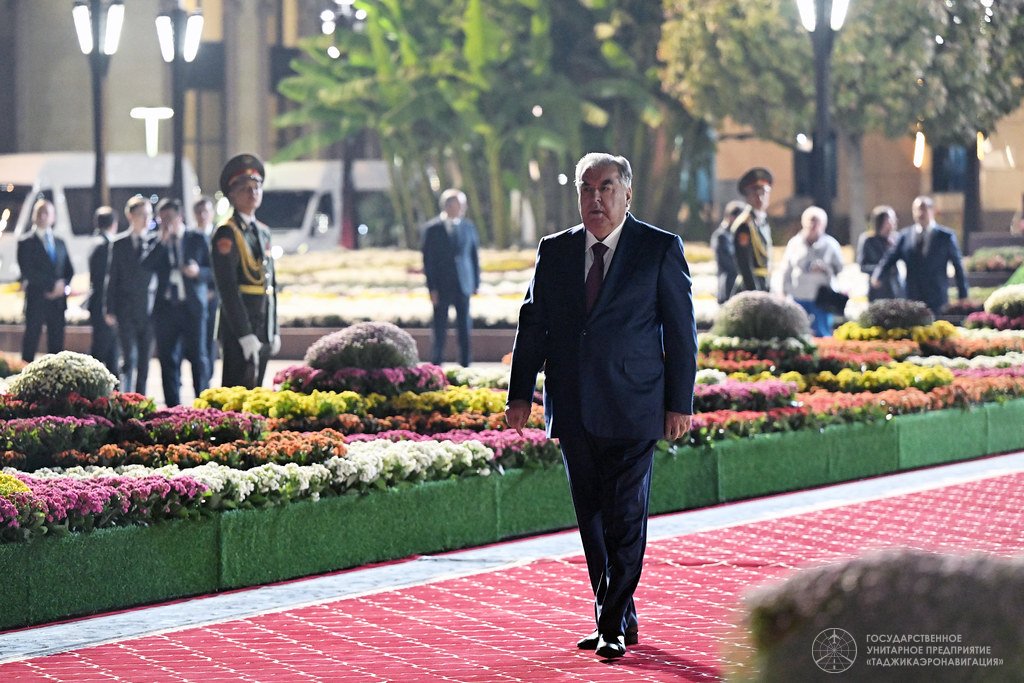 Президент Республики Таджикистан, Лидер нации уважаемый Эмомали Рахмон в знак высокого уважения тепло и искренне встретил высокопоставленного гостя - Президента Российской Федерации уважаемого Владимира Путина.